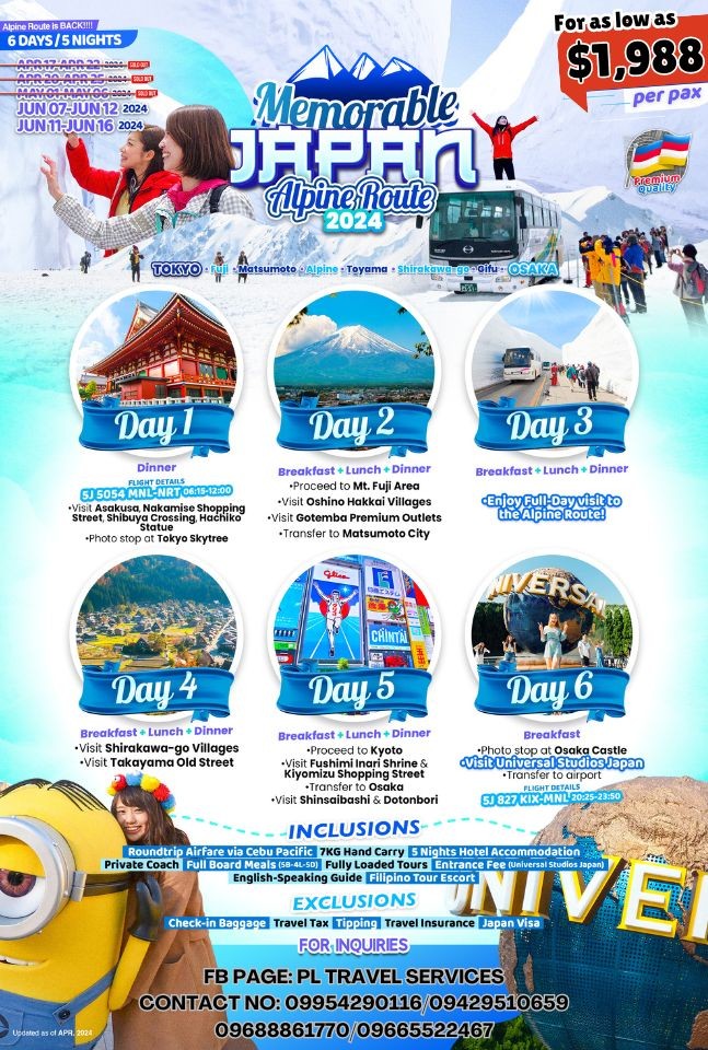 DAY 6- OSAKA – MANILA (B/-/-) Visit Osaka Castle for photo stop. Filled with history, this castle is one of the most iconic sights in Japan. With five stories and over 450 years of history, it’s no wonder that this architectural wonder is one of the most popular destinations in the country. After taking some pictures at the castle, we’ll proceed to Universal Studios Japan to enjoy all sorts of rides, games and attractions. Then, transfer to airport for departure to Manila.