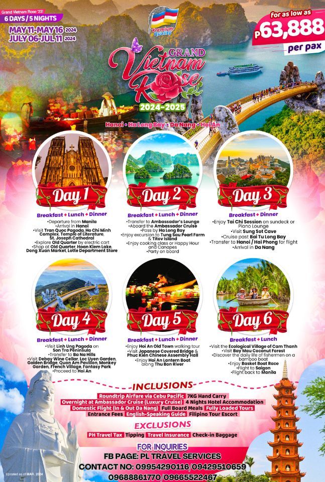 DAY 1- MANILA – HANOI – FULL DAY CITY TOUR – SHOPPING (B/L/D)- Simply pack your bag for 3 hours flight to Hanoi – the charming ancient capital. Arrive in Hanoi International arrival, please proceed through immigration and customs, and make your way to the exterior arrivals area, using the exit indicated for your flight on the arrival marquee (either exit A1 or A2). Our guide will be waiting here for you holding a pick-up sign then escort to Hanoi center for city orientation. Breakfast will be arranged along the way. You have a day to discover Vietnam’s charming capital. First stop would be Tran Quoc Pagoda then Ho Chi Minh Complex. Taste amazing Vietnamese cuisine at traditional Home Moc Vietnamese Restaurant. In the afternoon, discover the Temple of Literature, Vietnam’s first university dating back to the 11th century, St. Joseph Cathedral for religious activity. Experience the bustling Old Quarter by electric cart. Time for shopping at the Old Quarter, Hoan Kiem Lake, Dong Xuan Market, and Lotte Department Store until end of the day. Dinner at Lotus Buffet Restaurant then your overnight will be in Hanoi. Hanoi is the oldest capital city in Southeast Asia. Up to now, Hanoi has been one of the few cities in Asia left entirely void of the western-style boxy business architecture. We Hanoi people regard our capital city as heart of Vietnam. Hanoi has always been a symbol of culture and a source of pride throughout the history.