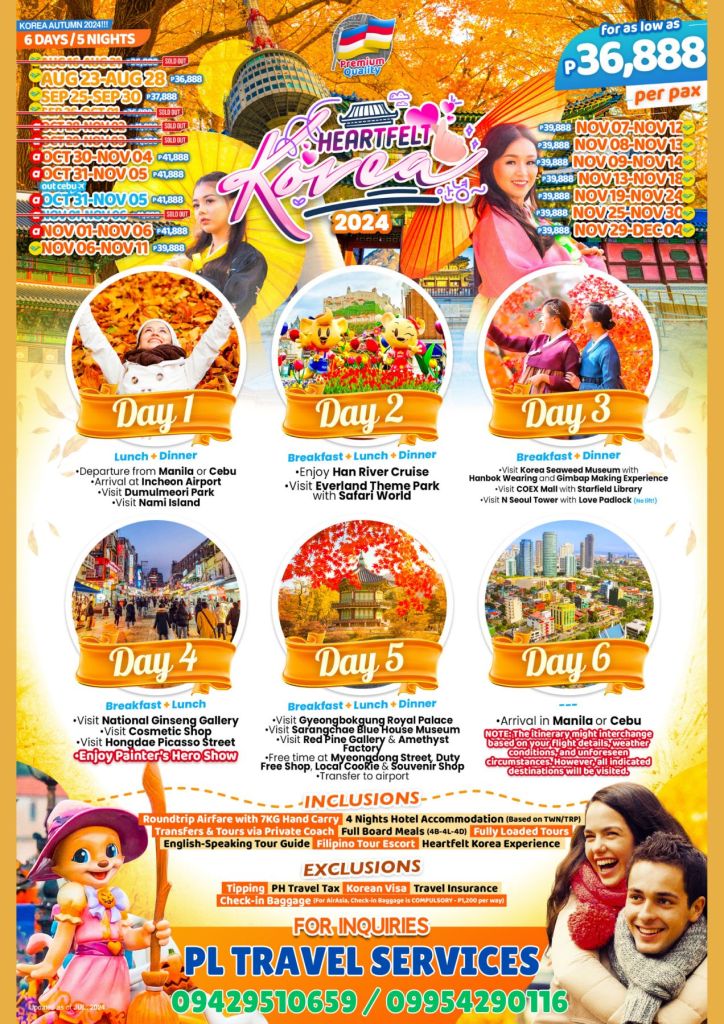 DAY 1 MANILA – DUMULMEORI PARK – NAMI ISLAND (-/L/D) Embark on an exciting journey as you depart from Manila and arrive at Incheon Airport. Dive into the charm of Korea’s Autumn season with a visit to Dumulmeori Park, known for its