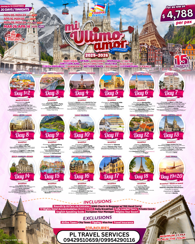 FULL PAYMENT MUST BE SETTLED 45 DAYS BEFORE THE DEPARTURE DATE. FAILURE TO PAY THE REMAINING BALANCE, THE COMPANY RESERVES THE RIGHT TO CANCEL THE BOOKING WITHOUT PRIOR NOTICE. THE RESERVATION FEE/DOWN PAYMENTS WILL BE FORFEITED.