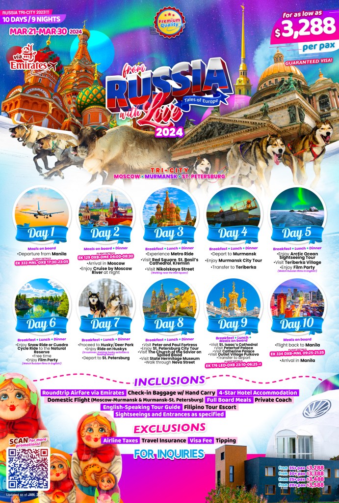 DAY 3: MOSCOW (B/L/D) After breakfast, pax will experience Metro Ride to visit: Red Square, St. Basil, The Kremlin, Lunch, then visit Nikolskaya Street. Return back to the hotel by Bus. Dinner at the hotel.