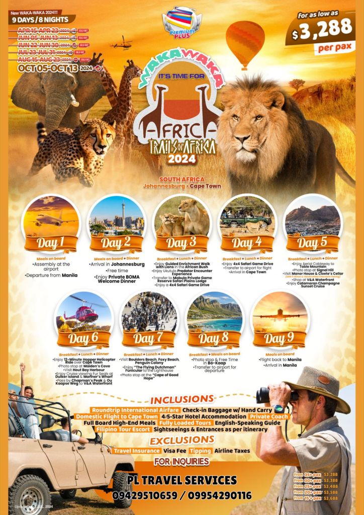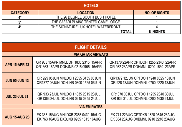 DAY 1: MANILA – JOHANNESBURG ( MEALS ON BOARD / DINNER ) Departure from Manila. International flight arrives in Johannesburg (South Africa) – guests will be met