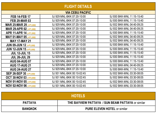 DAY 1 MANILA – PATTAYA (-/L/-) Arrival, meet, and transfer to Pattaya. Visit Nong Nooch Village & Tropical Garden with Thai Cultural Show, Elephant Show, and Tram Ride. Then, free and easy.