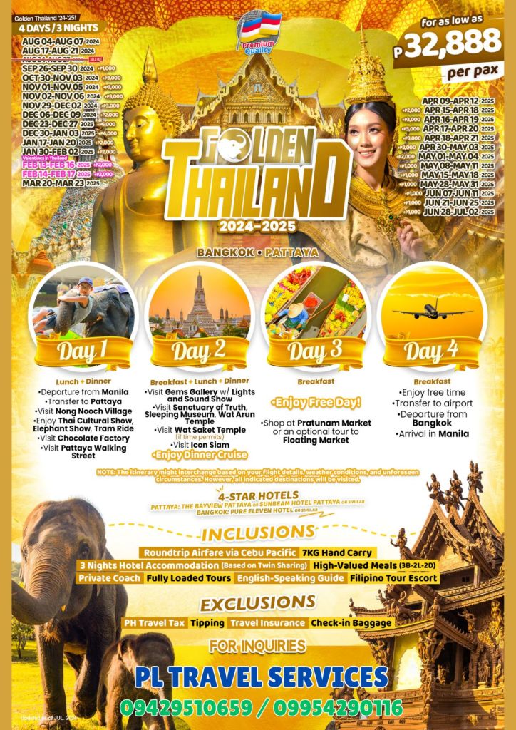 DAY 4 BANGKOK – MANILA (B/-/-) Breakfast at the hotel, then checkout. Transfer to airport for departure to Manila.
