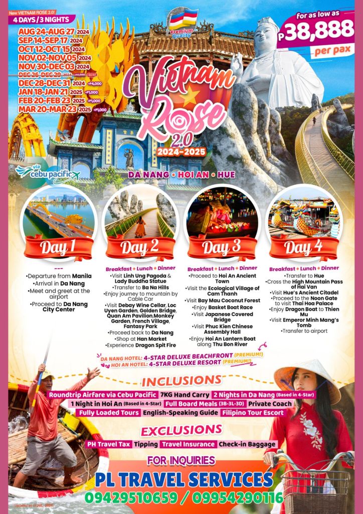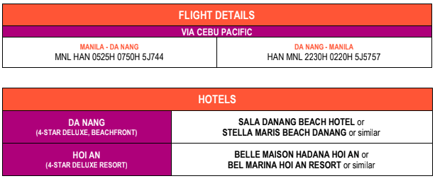DAY 4 HOI AN – HUE – DA NANG – MANILA (B/L/D) Breakfast at the hotel then checkout and drive to Hue. On the way, you’ll cross the High Mountain Pass of Hai Van. The views from top are excellent – you should be able be able to see Lang Co Beach,